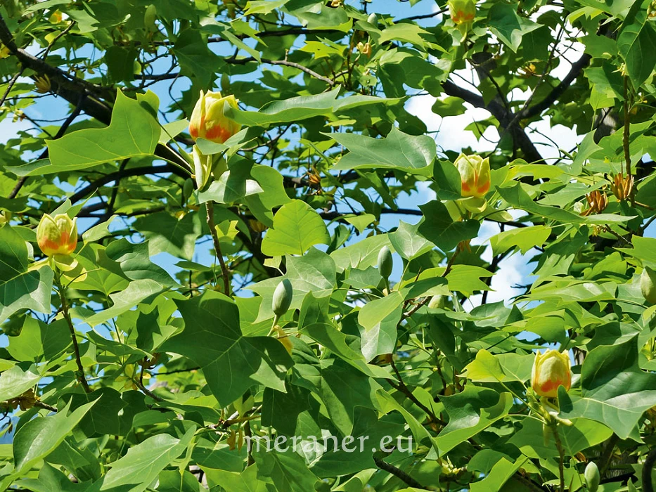 Der Tulpenbaum ist im östlichen und südöstlichen Nordamerika beheimatet, wo er bis 60 m hoch und rund 500 Jahre alt wird. Im Nordosten Amerikas ist der Tulpenbaum eine der wichtigsten Laubbaumarten und wird als Holzlieferant genutzt; in Europa ist er 1663 eingeführt worden und wird seither wegen seiner Schönheit und Anpassungsfähigkeit als Park- und Zierbaum gerne angepflanzt. Gleichzeitig mit der Errichtung der Winterpromenade, 1863, wurden auch in Meran am oberen Ende der Wandelhalle zwei Bäume gepflanzt, die demnach die ältesten und höchsten Exemplare in Meran sein dürften.