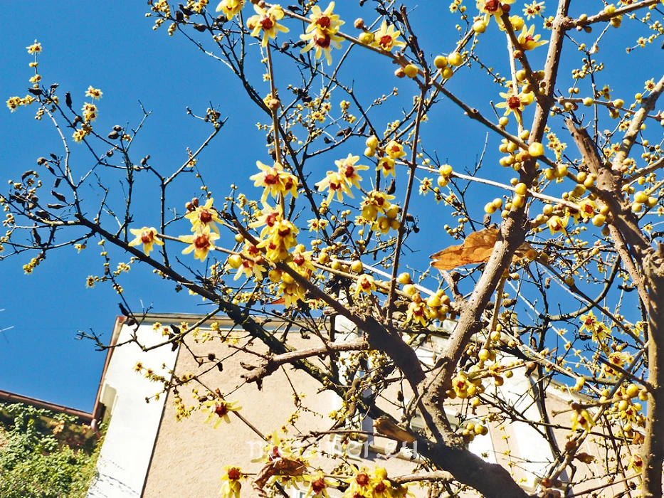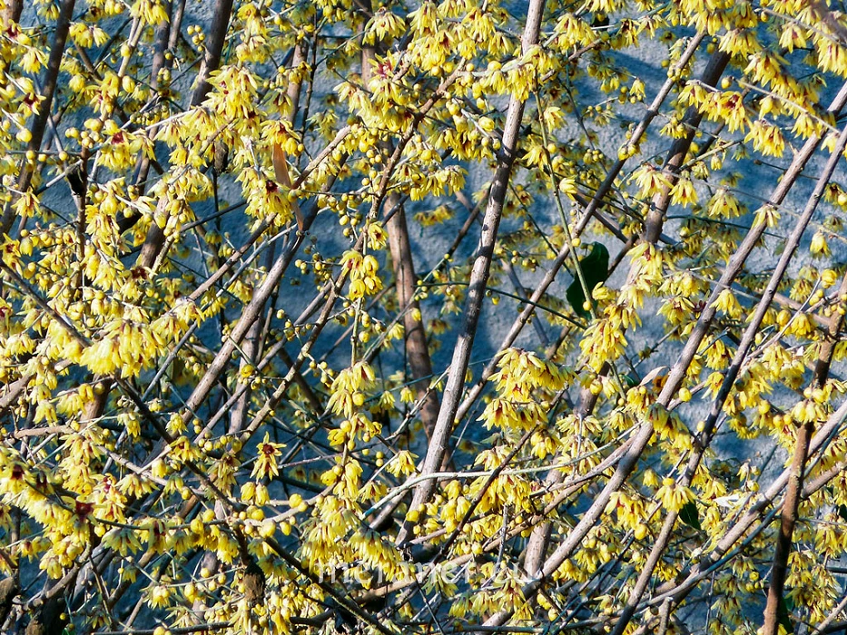 Bei einigermaßen milder Witterung kann der Strauch bereits im Jänner mit der Blüte beginnen. An milden Tagen öffnen sich dann überraschend Hunderte der goldgelben kugeligen beschuppten Blütenknospen, die sich im Spätherbst auf dem älteren Holz gebildet hatten.