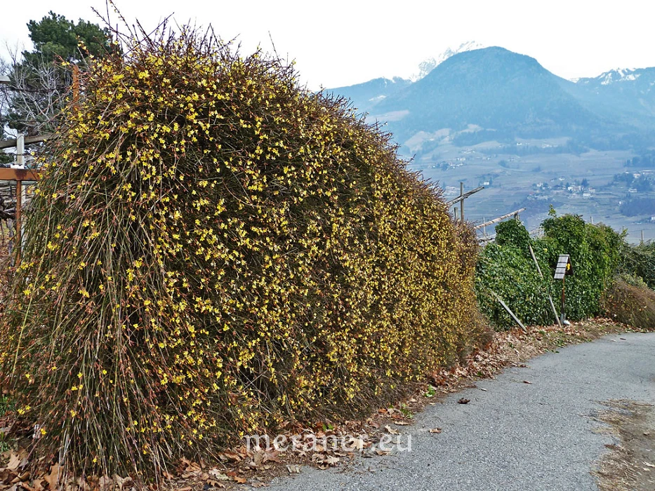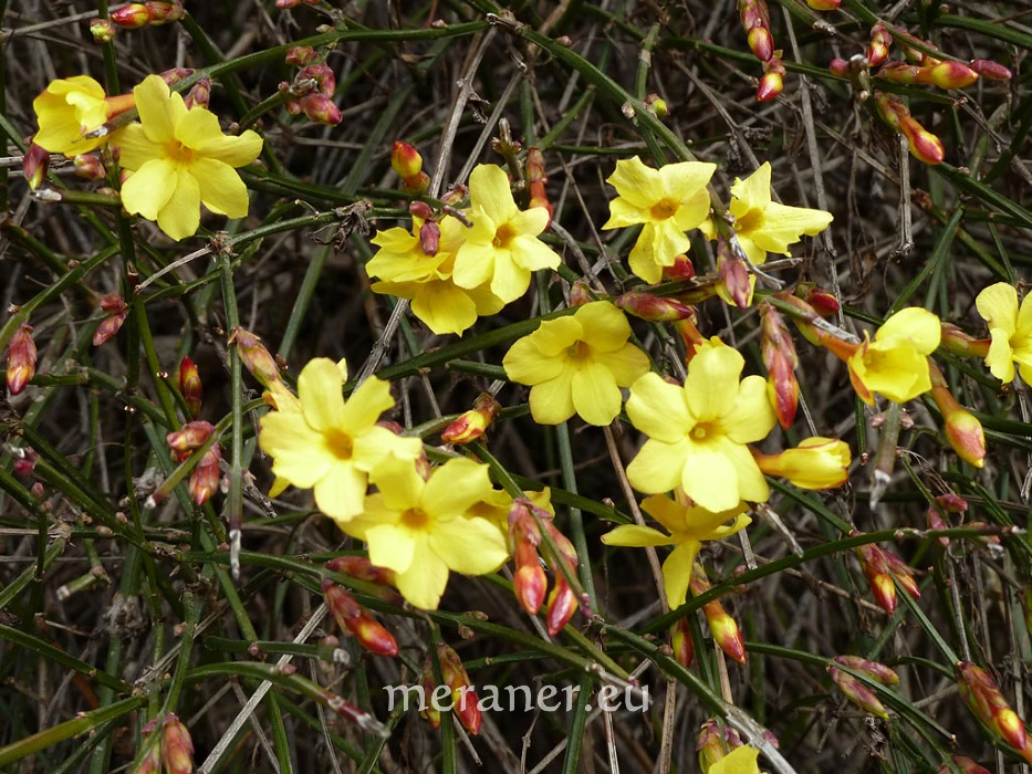 Der Winterjasmin gehört zur Pflanzengattung Jasminum in der Familie der Ölbaumgewächse (Oleaceae). Er stammt ursprünglich aus dem nördlichen und westlichen China und gelangte 1844 auch nach Europa. Heute ist er eine Zierpflanze an geschützten Stellen oder Wänden und Steinmauern entlang der Promenaden, in Parks und Gärten.
