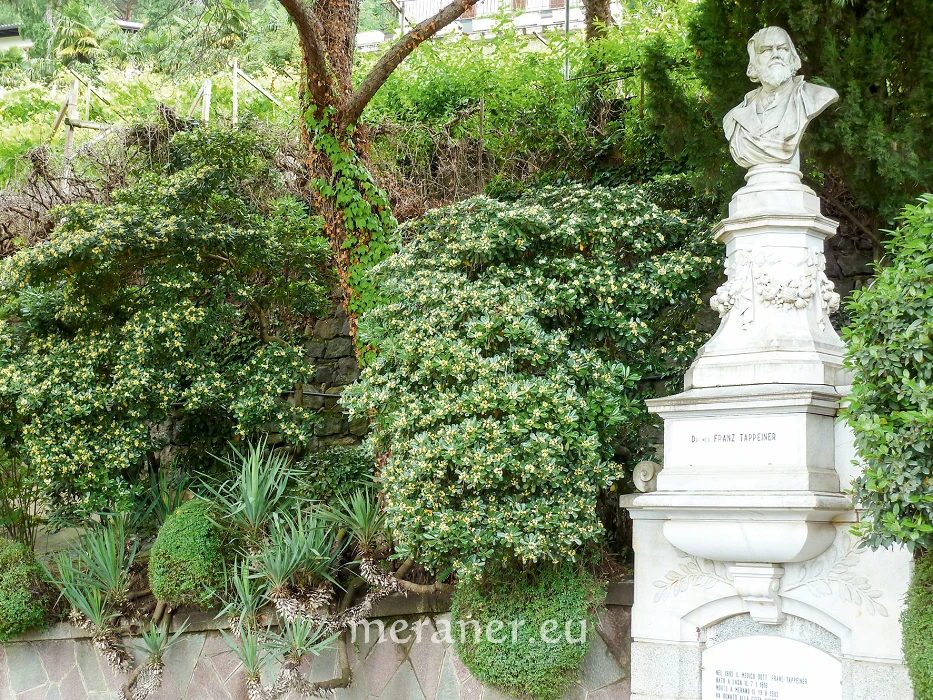 Vorkommen: am Tappeinerweg und den Zugängen, große Exemplare beim Tappeiner-Denkmal und beim Pulverturm, in Trögen gepflanzt dienen sie zur Begrenzung von Straßencafès, in privaten Gärten. Als Kübelpflanze werden z.B. in der Freiheitsstraße Sorten mit schmucken panaschierten Blättern aufgestellt.