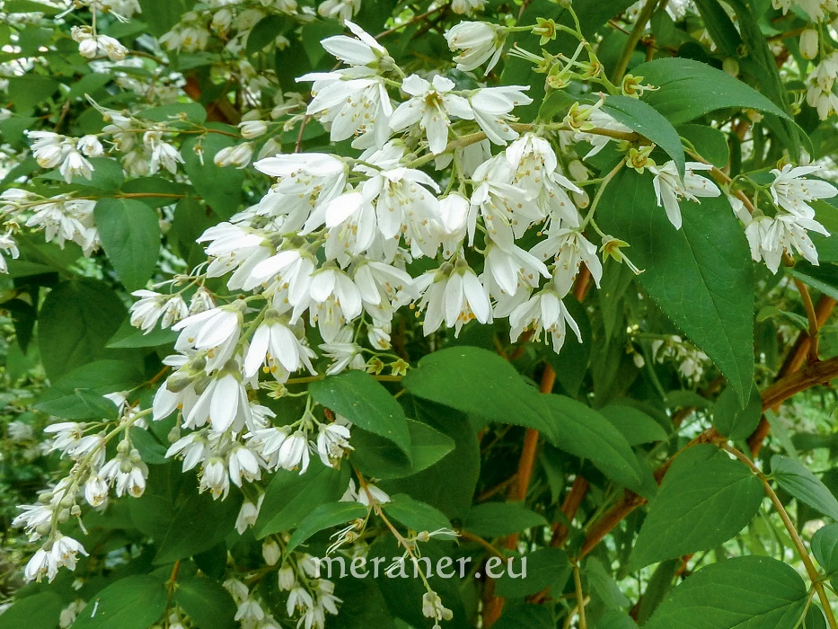 Mit dem in der letzten Ausgabe beschriebenen Europäischen Pfeifenstrauch nahe verwandt ist der Sternchenstrauch (Deutzia Thunb.), auch Deutzie genannt. Es ist ein anspruchsloser und anpassungsfähiger, überreich blühender Strauch mit rund 60 Arten, die zumeist in Ostasien beheimatet sind. Er wurde um die Jahrhundertwende zum 20. Jh. in Europa eingeführt. Die Bestimmung der einzelnen Arten, Hybriden und Sorten ist schwierig und man braucht eine Lupe, um die charakteristisch geformten Staubfäden und Strahlen der Sternhaare zu untersuchen. Er gehört zur Familie der Hortensiengewächse (Hydrangeaceae), wie die ebenso beliebte Gartenhortensie (Hydrangea macrophylla). Der Gattungsname ehrt den Holländer Johann van der Deutz (1743-1788), einen Förderer des schwedischen Naturforschers C.P. Thunberg, der die südafrikanische und japanische Pflanzenwelt erforscht und viele Pflanzen erstbeschrieben hat.