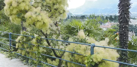 Im milden Klima Merans findet der wärmeliebende und lichtbedürftige Perückenstrauch (Cotinus coggyria Scop.) günstige Voraussetzungen für sein gutes Gedeihen. Er ist in einem Gebiet heimisch, das vom Mittelmeergebiet über den Balkan und das südwestliche Asien bis China reicht. Der Perückenstrauch gehört in die Familie der Sumachgewächse (Anacardiaceae). Wegen seiner perückenartigen Fruchtstände und seiner besonders schönen Herbstfärbung ist er seit Mitte des 17. Jh. als...