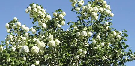 In Auenwäldern, an Waldrändern und in feuchten Gebüschen trifft man häufig den Gewöhnlichen Schneeball ( Viburnum opulus L.) an. Seine weißen Blüten stehen in tellerförmigen Trugdolden; ein äußerer Kranz von unfruchtbaren Schaublüten lockt Insekten an, um die fruchtbaren Innenblüten zu bestäuben. Die Sorte ´roseum´ dieser Art hat schneeballähnliche Blütenstände mit rein weißen, nur sterilen Schaublüten : diese haben dem Garten-Schneeball den...