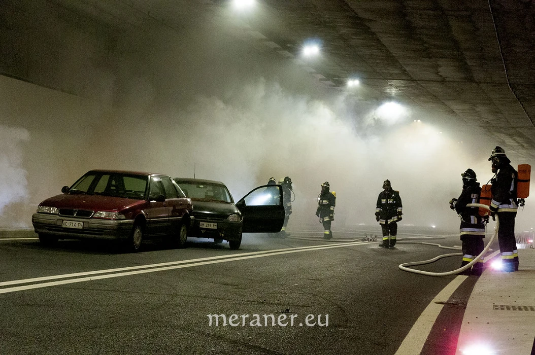 Ing. Manfred Ebner nennt ein paar Zahlen, welche für Techniker bedeutend sein dürften, aber das Vorstellungsvermögen von Laien übersteigen: z. B. wurden für den Aushub des Tunnels 470.000 m³ Erdreich bewegt. Das sind 7.000 LKW-Ladungen und entspricht einer 100 km langen LKW-Kolonne, viermal von Meran bis Bozen. Alle eingesetzten LKW mussten mindestens der Euronorm Abgasklasse 4 (EURO 4) angehören. Zum größten Teil wurde das Aushubmaterial zur Herstellung von Beton und zum Wiederauffüllen verwendet. 83.000 m³ Beton wurden gegossen, mit 9.500 Tonnen Stahl, man könnte sagen das ist das gleiche Volumen wie 80 Zweifamilienwohnhäuser. Mit den 50.000 m² ausgebrachten Asphalt könnte man 7 Fußballfelder asphaltieren. Verlegt wurden auch 26 km Rohre und 40 km Kanäle. In diesen befinden sich 190 km Kabel! Diese versorgen die Beleuchtung, die 12 Längsventilatoren und die diversen Wasserpumpen mit Strom, mit einem Anschlusswert von 370 KW. Dazu kommen noch 470 KW Anschlusswert für die Brandschutzventilatoren, falls diese in Betrieb gehen müssten. Würde der Strom ausfallen, übernehmen innerhalb kürzester Zeit drei Notstromaggregate die Stromversorgung. Die Längsventilatoren gehen in Betrieb, wenn die elektronisch überwachte Luftqualität es erfordert, blasen die verbrauchte Luft in Richtung MeBo hinaus und saugen Frischluft im Bereich des Bahnhofs an. Etwas ganz anderes geschieht im Brandfall: Dann saugen zwei Axialventilatoren über Schächte alle 75 Meter die Rauchgase ab und befördern sie über besondere Kanäle ins Freie. Bei einer Feuerwehrübung mit einem simulierten Ölbrand konnte man feststellen, dass schon wenige Meter neben der Brandstelle die Luft wieder eingeatmet werden konnte. Die Feuerwehr und das Weiße und Rote Kreuz hatten ebenfalls den Einsatz bei einem simulierten Unfall geprobt. Die neuesten Sicherheitsnormen haben auch eine Videoüberwachung notwendig gemacht. Diese ist ununterbrochen mit der Zivilschutzzentrale in Bozen, mit der Feuerwehr in Meran und mit der Stadtpolizei verbunden. Bei Unregelmäßigkeiten werden alle drei Stellen sofort alarmiert.