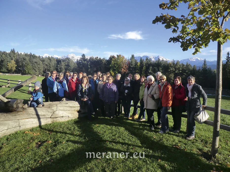 Der Törggeleausflug der Kfb-Gruppe St. Nikolaus Meran führte heuer auf das wunderschöne Hochplateau des Rittens. Die Fahrt ging am frühen Nachmittag in Meran los und das erste Ziel war der Kaserhof auf 1.320 m Höhe in Oberbozen. Die Teilnehmerinnen erwartete ein herrliches Bergpanorama, im Vordergrund das bunte Laub der Bäume und im Hintergrund die mit Schnee überzuckerten Spitzen der Dolomiten: Rosengartengruppe, Lang- und Plattkofel, Sellastock, Latemargruppe, Peitlerkofel. Wer wollte, konnte in dem Bauernhofcafé einen hausgemachten Kuchen essen und Kaffee trinken. Danach erzählte die Wirtin Frau Mair mit großer Begeisterung allerlei über die Entstehungsgeschichte ihrer Hofschenke. Seit dem Jahre 1996 züchtet Familie Mair am "Kaserhof" Lamas und Alpakas sowie Vollblut-Araber-Pferde. Alle Vierbeiner sind Freilandtiere, d.h. sie sind Sommer wie Winter in freier Natur. Die Lama- und Alpakazucht des Kaserhofs ist mit etwa 120 Kameliden die älteste und größte in Italien und die erfolgreichste in Europa.