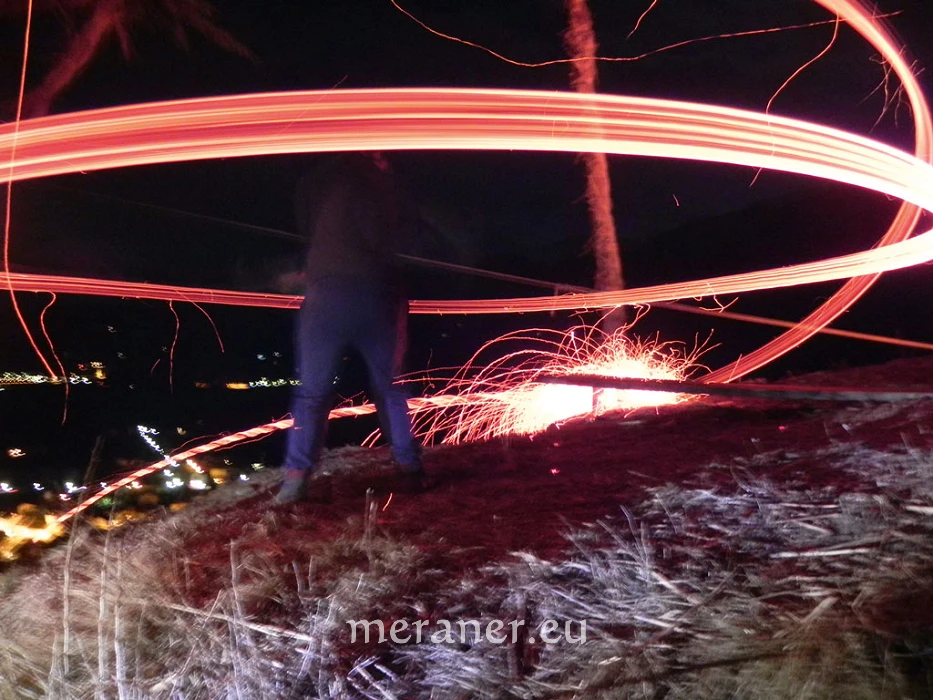 Am Kreuzegg hoch über Schluderns loderte in einer Mulde bereits ein großes Feuer und junge Burschen hielten runde Holzscheiben aus Birkenholz in die Glut, die am Ende langer, elastischer Haselnussruten steckten.