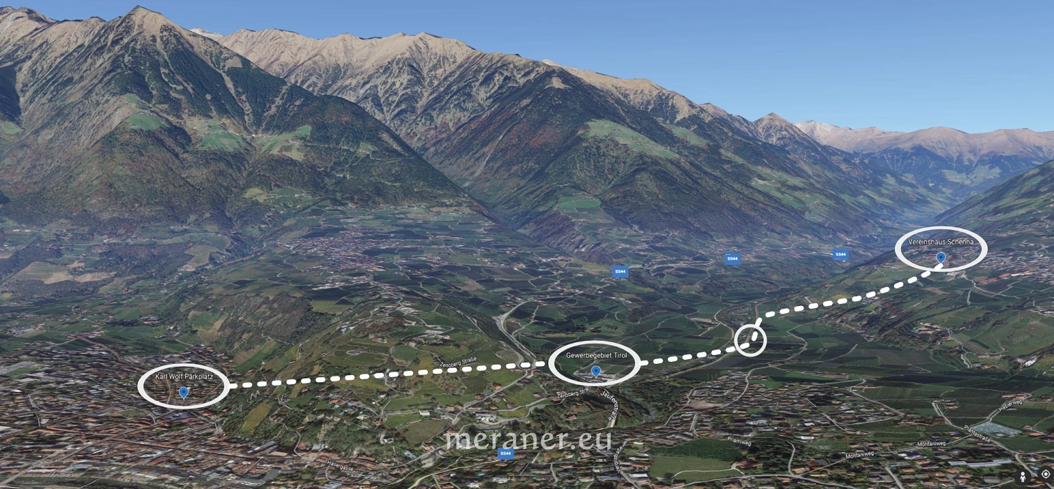 Als Startpunkt der Standseilbahn nach Schenna wurde der bestehende Parkplatz Karl Wolf gewählt, da dort Bushaltestellen und weitere Parkplätze angelegt werden können. Dort soll, über Rampen erreichbar, im nördlichen Bereich die Talstation errichtet werden. Die vorgeschlagene einspurige Lösung besteht aus zwei Pendelzügen für je maximal 180 Fahrgäste zwischen den beiden Endstationen. Die Endstation in Schenna soll neben dem Vereinshaus entstehen.