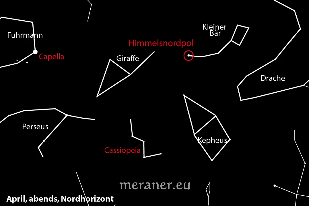 Im Zenit nördlich des Passeiertales kann man jetzt im Frühjahr den Kleinen Wagen oder Bären gut in Augenschein nehmen, sowie den Drachen, der sich um ihn windet. Beide sind, gleich wie der Große Wagen oder Bär, um den Nordpol kreisende Sternbilder und daher in unseren Breiten das ganze Jahr zu sehen. Jetzt stehen sie am höchsten und haben daher genügend Abstand zum dunstigen Horizont.