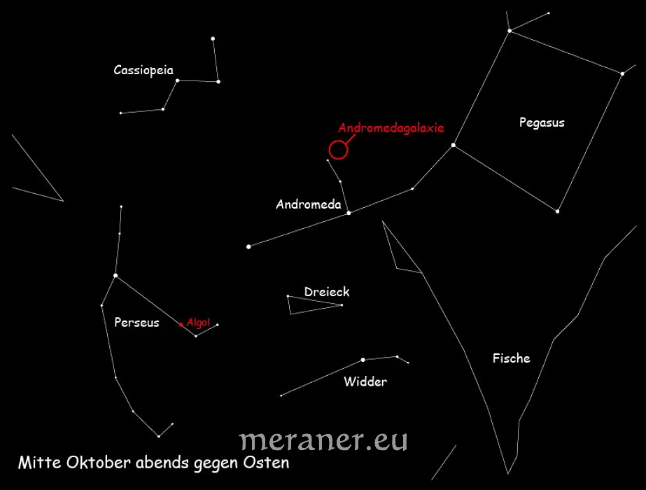 Über der Sternenlinie von Andromeda leuchtet das Sternbild Kassiopeia, besser bekannt als Himmels-W. Die Sternenlinie weist auf ein weiteres Herbststernbild – Perseus, mit seinem zweithellsten Stern, Algol, das Teufelsauge (siehe Abbildung). Eigentlich sind es zwei Sterne, die einander umkreisen. Dabei verdeckt der eine Stern periodisch den anderen, sodass es zu Helligkeitsschwankungen kommt.