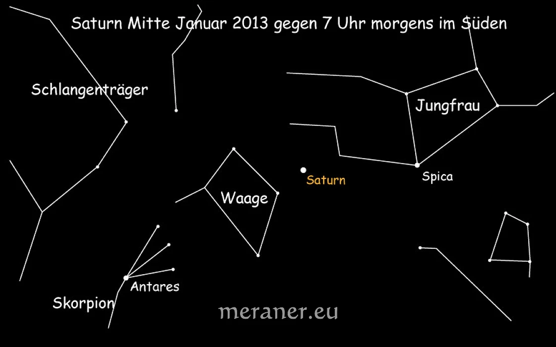 Saturn erscheint morgens im Süden, zwischen den Sternbildern Waage und Jungfrau. Der auffällige und helle Stern Spica ist nicht weit von ihm entfernt. Gegen 7 Uhr (siehe Abbildung) stehen die beiden in etwa waagerecht nebeneinander.