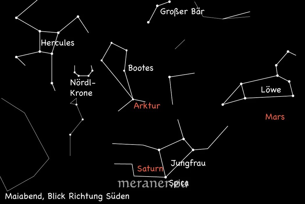 Sie stehen nach Einbruch der späten Dämmerung bereits am südöstlichen Himmel. Als da wären der Löwe mit dem Königsstern Regulus, der Bärenhüter Bootes mit dem hellen Hauptstern Arkturus in der Verlängerung der ‚Deichsel’ vom Großen Wagen, und natürlich die Jungfrau mit Spica (der Ähre). Außerdem halten sich die Planeten Mars und Saturn innerhalb dieses sogenannten Frühlingsdreiecks auf. Links vom Bärenhüter erscheint die Nördliche Krone, deren etwas weniger hellen Sterne einen Halbkreis bilden, sodass sich der Eindruck einer Diamantenkette ergibt.
