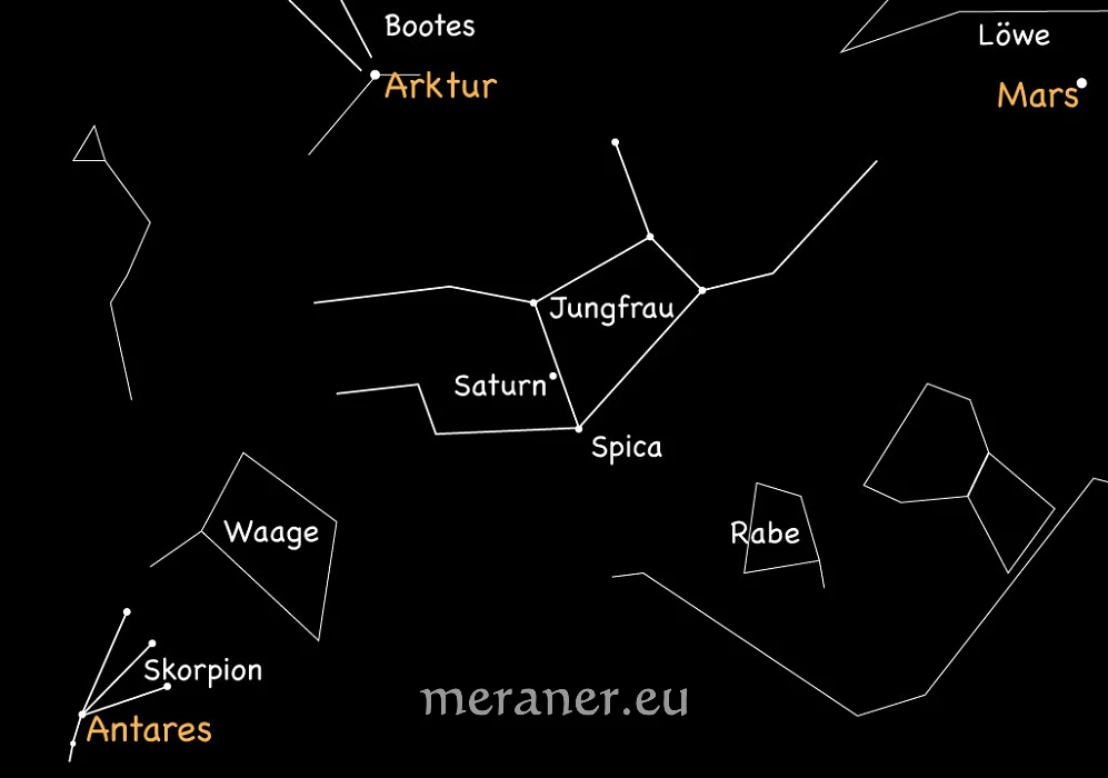 Mars, der rote Planet, ist inzwischen am unteren Rand des Sternbildes Löwe wieder rechtsläufig geworden. Gegen Mitternacht erhebt sich ein weiterer rötlicher Punkt tief am südöstlichen Himmel: Antares, der ‚Anti-Mars’ im aufziehenden Sternbild Skorpion. Damit versammeln sich in dieser Himmelsregion derzeit zusammen mit Arkturus, dem vierthellsten Stern überhaupt, drei rötlich leuchtende Objekte, die von erhöhten Standpunkten aus gut sichtbar sind.