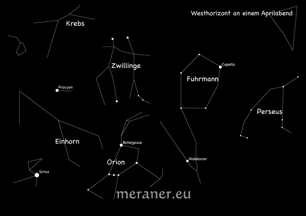 Die Frühlingssternbilder haben inzwischen die Vorherrschaft am Himmel übernommen und verdrängen nach und nach die Wintersternbilder bis an den westlichen Horizont, wo sie langsam untergehen. Verabschieden wir uns also gegen Mitternacht von Sirius im Großen Hund, von Perseus, dem Stier und dem schönen Orion. Der Blick nach Westen am späten Abend zeigt ungefähr das nebenstehende Bild.