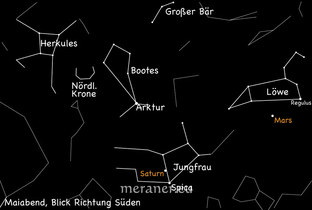 Jetzt im Mai stehen die Frühlingssternbilder nach Einbruch der Dämmerung bereits am südlichen Himmel, als da sind: der Löwe mit seinem Hauptstern Regulus, Bootes oder der Bärenhüter mit Arktur(us) und das Sternbild Jungfrau mit seinem Hauptstern Spica.
