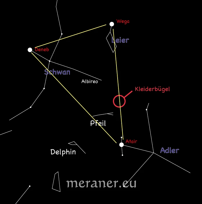 Mit einem Fernglas oder einem Teleskop kann man natürlich noch viel mehr in dieser Himmelsgegend entdecken. Etwa wenn man vom Doppelstern Albireo im Sternbild Schwan langsam in Richtung Atair schwenkt, so bleibt man an einer Sternkonstellation hängen, die den Namen Kleiderbügel trägt. Es ist ein kleiner, offener Sternhaufen in einer geraden Linie, unter der weitere Sterne eine Krümmung beschreiben, die die Form eines Kleiderbügels ergibt oder wahlweise auch eine Kette mit Medaillon – ganz nach der Fantasie des Betrachters.