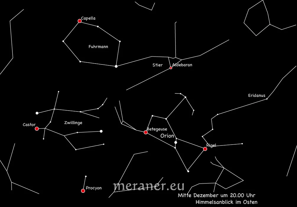Die Wintersternbilder erobern sich mittlerweile im Laufe des Abends den Himmel. Unter dem Fuhrmann mit dem hellen Hauptstern Capella erscheint das bekannteste Wintersternbild schlechthin, Orion, mit seinem markanten Sternen-H, dem hellen rötlichen Schulterstern Beteigeuze und dem bläulich-weißen Kniestern Rigel. Je weiter der Abend fortschreitet, desto mehr Sternbilder werden sichtbar. Unter dem Orion ‚springt‘ der Hase herum. Der ‚Himmelsjäger‘ ist nämlich gerade auf der Jagd mit seinen beiden Hunden, den Sternbildern Großer Hund und Kleiner Hund. Die Sterne des Großen Hundes bilden tatsächlich die Umrisse eines Hundes, mit dem hellsten Stern des Himmels, Sirius, als funkelndem Diamanten an seinem Halsband. Der Kleine Hund besteht aus nur zwei gut sichtbaren Sternen. Der hellere davon heißt Procyon, das heißt übersetzt ‚vor dem Hund‘ und bedeutet, dass er noch vorher aufgeht. Über den Hunden erscheint in der Folge das Sternbild Zwillinge mit den hellen Sternen Castor und Pollux. An jedem der beiden hängt noch jeweils eine Sternenkette mit schwachen Sternen, die Richtung Orion zeigen.