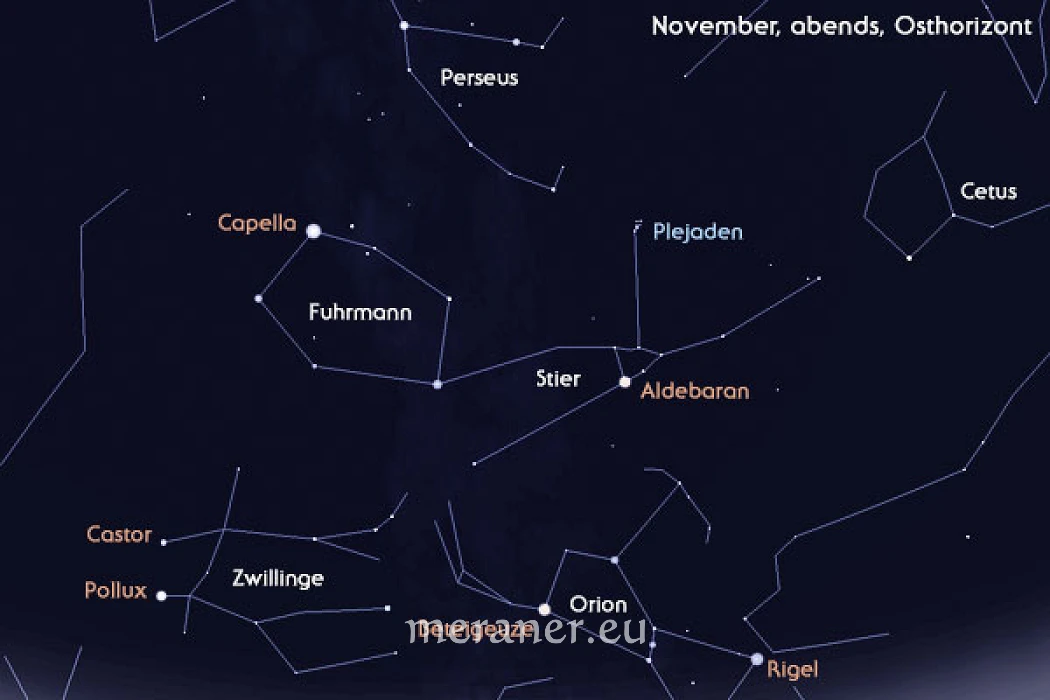Schon früh am Abend präsentieren sich hoch im Osten und Süden die Herbststernbilder, während die Planeten Venus und Saturn bereits in der Dämmerung versinken. Das Sternenviereck von Pegasus dominiert noch den südlichen Himmel. Am östlichen Horizont aber rücken mit den Plejaden bereits die Vorboten des nahen Winters nach. Das Siebengestirn gehört zum Sternbild Stier, das die beiden bekanntesten Sternhaufen enthält, eben die Plejaden und die Hyaden. Markant zieht zunächst das Sternbild Fuhrmann mit dem hellen Hauptstern Capella herauf. Darunter erhebt sich allmählich das bekannteste Wintersternbild schlechthin, der Orion mit seinen rot und blau flimmernden Riesensternen, die nur noch der glänzende Sirius im Großen Hund (nicht im Bild) nach Mitternacht überstrahlt.