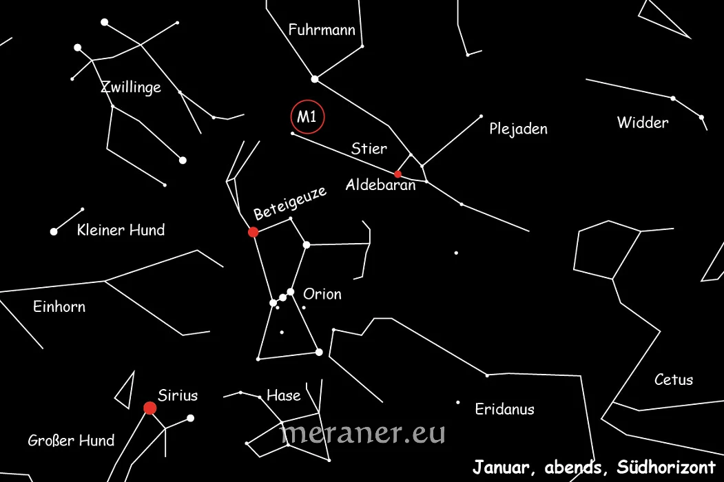 Wer ein Fernglas oder Teleskop zur Verfügung hat, kann sich jetzt etliche imposante Himmelsobjekte anschauen. Mit bloßem Auge deutlich sichtbar, zeigen sich die Sternhaufen Plejaden und Hyaden im Fernglas mit weiteren, schwächeren Sternen. Der Anblick gleicht einer geöffneten Schmuckschatulle, denn die Sterne funkeln farbenfroh in großer Pracht. Am prächtigsten aber funkelt Sirius, der hellste Stern in unseren Breiten, nur eben 9 Lichtjahre entfernt. Beteigeuze im Sternbild Orion macht dagegen mit seiner rötlichen Farbe auf sich aufmerksam. Es ist ein Riesenstern, der bereits am Ende seines Daseins angekommen ist und damit als möglicher Kandidat für eine Supernova gilt. Etwas weiter nördlich befindet sich neben dem linken Horn des Sternbildes Stier der sogenannte Krebsnebel M 1. Er stammt von einer Supernova, die im Jahr 1054 beobachtet wurde und deren Nebelreste in 6.300 Lichtjahren Entfernung sich seither immer weiter ausbreiten.