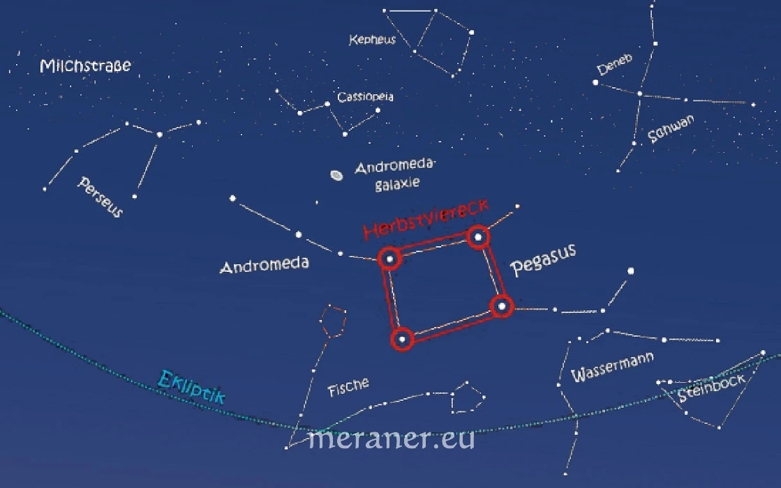 Die diesjährige Herbstrundschau beginnt beim wiedererschienenen Sternbild Pegasus, dem ‚geflügelten Pferd‘, das auf seinem Rücken gleichsam über den Himmel fliegt und in der Antike Musenross genannt wurde. Es galt als Inspirationsquelle für Künstler, weil es auf dem griechischen Parnass-Gebirge, der Heimat der Musen, mit seinem Hufschlag angeblich eine Quelle zum Sprudeln brachte. So der Mythos. Heutzutage betrachtet man es zur bloßen Orientierung auch als Herbstviereck (analog zum Sommerdreieck oder zum Wintersechseck). Dieses markante Sternenviereck ist kaum zu übersehen. Seine vier Sterne tragen die arabischen Namen Markab (Sattel des Pegasus), Scheat (Schulter des Pegasus), Algenib (Flügel an der Seite des Pegasus) und Sirrah, wobei Sirrah nicht mehr zu Pegasus gehört, sondern den ‚Kopf der Andromeda‘ bildet. Dieses Sternbild (mit der uns am nächsten liegenden Galaxie) setzt sich aus einer Kette von vier Sternen zusammen. Die benachbarten Sternbilder Perseus, Kassiopeia und Kepheus (siehe Himmelsausschnitt) erzählen von Liebe und Kampf, von Heldentaten und Verführungen. Sie erscheinen als Halbgötter, Könige und wundersame Gestalten, wie sie in früheren Zeiten in ihrer archetypischen Bedeutung geschaut wurden. Dabei traten sie den Betrachtern als Urbilder der seelischen Kräfte im Menschen entgegen und führen uns auch heute noch die Vielfalt menschlicher Beziehungen vor Augen.