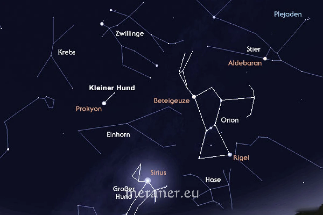 Das große X oder H des Sternbildes Orion ist an einem Winterabend schnell zu entdecken. Dort sind sie alle beisammen: der mythologische Himmelsjäger Orion, begleitet von seinen beiden treuen Hunden und dem Hasen. Der Kleine Hund links an seiner Schulter, mit dem hellen Hauptstern Prokyon; der Große Hund tiefer bei Fuß. Sie folgen ihm, denn sie gehen nacheinander am Himmel auf, erst Orion, dann der kleine und dann der große Hund.