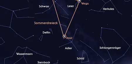 Im August nehmen die Sommersternbilder den gesamten Himmel ein. Hoch über unseren Köpfen finden wir als erstes den hellen Stern Wega aus dem Sternbild Leier . die anderen beiden Sterne des ‚Sommerdreiecks‘, nämlich Deneb im Schwan und Atair im Adler vervollständigen die Figur. Knapp über dem Horizont erhebt sich im Süden das Sternbild Schütze (nicht im Bild), wo die Milchstraße mit dem galaktischen Zentrum ihren Ausgang nimmt. Folgt unser Blick diesem hellen Band, gelangen wir wieder zum...