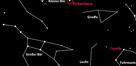 Zirkumpolare Sternbilder bewegen sich im Kreis um den Polarstern und sinken dabei nie unter den Horizont ab. Sie sind also jede klare Nacht am Himmel zu finden, so wie der Kleine und der Große Bär , der Drache , das ‚Himmels-W‘ Cassiopeia , oder zum Teil auch der Fuhrmann mit dem hellen Fixstern Capella . Alle anderen Sternbilder gehen dagegen auf und unter, so wie Sonne und Mond. Wenn wir an Septemberabenden hin und wieder nach Norden schauen, sehen wir, dass der Große Wagen / Bär zunehmend an Höhe verliert,...