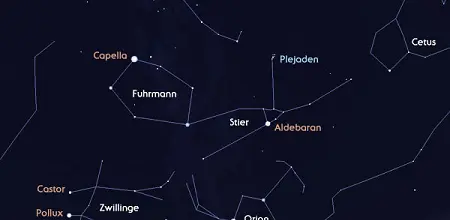 Schon früh am Abend präsentieren sich hoch im Osten und Süden die Herbststernbilder, während die Planeten Venus und Saturn bereits in der Dämmerung versinken. Das Sternenviereck von Pegasus dominiert noch den südlichen Himmel. Am östlichen Horizont aber rücken mit den Plejaden bereits die Vorboten des nahen Winters nach. Das Siebengestirn gehört zum Sternbild Stier , das die beiden bekanntesten Sternhaufen enthält, eben die Plejaden und die Hyaden . Markant zieht zunächst das Sternbild...