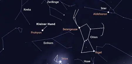 Das große X oder H des Sternbildes Orion ist an einem Winterabend schnell zu entdecken. Dort sind sie alle beisammen: der mythologische Himmelsjäger Orion, begleitet von seinen beiden treuen Hunden und dem Hasen. Der Kleine Hund links an seiner Schulter, mit dem hellen Hauptstern Prokyon ; der Große Hund tiefer bei Fuß. Sie folgen ihm, denn sie gehen nacheinander am Himmel auf, erst Orion , dann der kleine und dann der große Hund. Die drei Gürtelsterne des mächtigen Orion weisen in Richtung Alpha Canis...