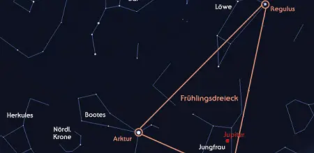 Um sich am Himmel mit freiem Auge zurechtzufinden, genügt es, sich einige markante Sternbilder einzuprägen. Mit ein paar kleinen Tricks lassen sich dann auch die weniger auffälligen Sternkonstellationen orten. Die Sternbilder Löwe, Jungfrau und Bootes beherrschen den Frühlingssternenhimmel. Ihre hellen Fixsterne Regulus, Spica und Arkturus erstrahlen jeweils im Mai in einem schönen Frühlingsdreieck, aktuell begleitet vom Highlight Jupiter. Ausgangspunkt der Suche ist der allseits bekannte Große Wagen (als...