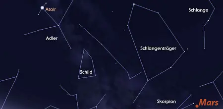 Im Juli ist ein Blick gegen Mitternacht Richtung Süden empfehlenswert. Knapp über dem Horizont steht dort das Sternbild Skorpion , unverkennbar mit seinen Scheren. Man kann in unseren Breiten den Skorpion zwar nie vollständig sehen, doch allein diese Scheren und der rötlich funkelnde Hauptstern Antares sind schon sehr eindrucksvoll. Leicht östlich findet sich das Sternbild Schütze , das wie eine Teekanne aussieht. Der rote Planet, schön sichtbar, zieht im Sommer durch diese Himmelslandschaft. Mars steht im...