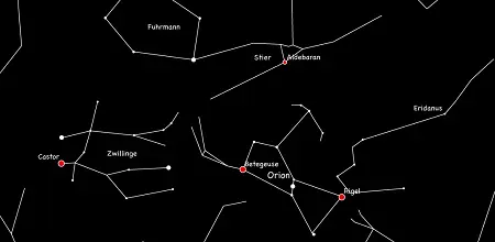 Im Februar dominieren die Wintersternbilder den Himmel am Südhorizont. In keiner anderen Jahreszeit stehen gleichzeitig so viele helle Sterne am Himmel. Castor, Pollux, Capella, Beteigeuze, Rigel, Aldebaran, Sirius und Procyon werden den bekannten Sternbildern Zwillinge, Fuhrmann, Orion, Stier, Großer und Kleiner Hund zugeordnet. All diese Sternbilder gruppieren sich um das markante Sternen-X des Orion . Ihre Sterne bilden zusammen das ‚Wintersechseck’.