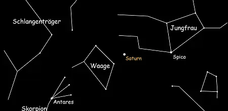 Nicht weit von ihm entfernt befindet sich im Sternbild Jungfrau ein weiterer Planet – Saturn . Auch er geht zeitig unter und kann in der Abenddämmerung nur kurz beobachtet werden (siehe Abbildung). Unweit von Mars leuchtet der Fixstern Antares (der Gegenmars) im eindrucksvollen Sternbild Skorpion....