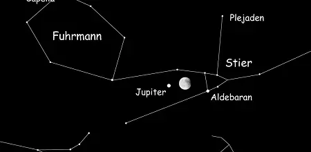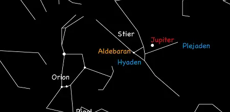 Jupiter am Abendhimmel Jupiter im Sternbild Stier steht bereits hoch am Firmament, wenn es dunkel wird. Er strahlt mit -2,5 Magnitude deutlich heller als der nächste helle Stern, Aldebaran , und ist nach wie vor das auffälligste Objekt am ganzen Himmel. Auch der glänzende Sirius , mit -1,46 mag der absolut hellste Stern des nördlichen Sternenhimmels, reicht nicht an die Strahlkraft Jupiters heran. Nicht weit von Jupiter entfernt finden sich zwei der schönsten Sternhaufen - die Plejaden und die Hyaden . Wie in...