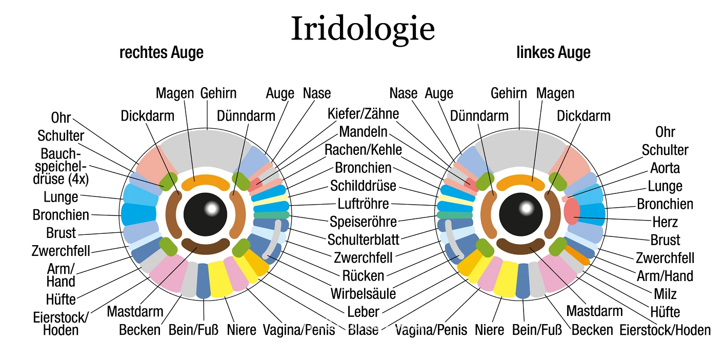 Unabhängig von der Iridologie kann man tatsächlich anhand von Veränderungen der Regenbogenhaut auf weitere Organschäden schließen. Gerade Genetiker konsultieren routinemäßig den Augenarzt, um die Verdachtsdiagnose einer genetischen Erkrankung ohne weitere aufwendige Untersuchungen bestätigen zu lassen.