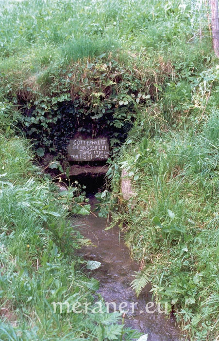 Der Waal rinnt dann weiter zwischen den Höfen Außerleiter und Bäcksteiner hindurch, am Tannharthof und Schloss Planta vorbei durch die Güter des ehemaligen Abendbauern und des Pröfingerhofes, unterquert beim Kripplerhof die Schennastraße und zieht am Bauhof, Grieser- und Stadlerhof entlang bis zum Naifbach, wo er schließlich unweit des alten Mairhofes St. Valentin einmündet. Die Besitzer von St. Valentin und Schloss Trauttmansdorff führen das Wasser-Wasser durch eine Rohrleitung, früher durch ein „Holzgschal“, über den Naifbach hinweg in ihre Obst- und Gartenanlagen. Der Höhenunterschied zwischen der Einkehr bei Saltaus und der Einmündung in den Naifbach beträgt nur 51 Höhenmeter, daher fließt das Wasser auf der gesamten, rund 8,5 km langen Strecke fast eben dahin.