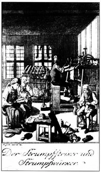 Nach der Aufhebung des Edikts von Nantes 1685 durch Ludwig XIV. (1643-1715) und der Verfolgung der Hugenotten wanderten aus Frankreich nahezu eine halbe Million Protestanten in die protestantischen Gegenden Deutschlands aus, darunter viele Strumpfwirker, die außer ihren Handwirkstühlen auch die neue Arbeitstechnik der Strumpfwirkerei mitbrachten.