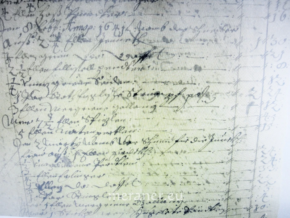 Im Raum Burggrafenamt belegen Aufzeichnungen von Kleiderinventaren und Kaufmannsaufzeichnungen des 16. Jahrhunderts vor allem den Gebrauch von Strumpfwaren: Paul Hagen, Zöllner auf der Töll, hinterließ beispielsweise 1645 zwei par plab halbseidene strimpf und zwai par griene ennglische strimpf. Selbst geflickte Strümpfe waren es früher wert, im Inventar aufgenommen zu werden, wie folgender Textausschnitt des Nachlasses von Martin Satlperg aus Tscherms (1669) belegt: Ain alts gflickhtes par seidne vnd ain par halb seidne strimpf per 1 fl (Gulden). Aber nicht nur Adlige, Bürger und Bauern trugen Strümpfe, auch Angehörige der Geistlichkeit wussten deren Bequemlichkeit und Wärme zu schätzen. So geht aus einem Auszug einer Kostenaufstellung, der von einem Meraner Krämer An die Erwirdige in Gottes Andechtige Fraw Rossäly geborne Tschinin In wirdigen Junckhfraúen Closster St. Clara Ordens etc. alhie (Klarissinnenkloster Meran, am Kornplatz, heutiger Sitz der Volksbank bzw. des Frauenmuseums) gerichtet war, hervor, dass besagte Rosalia Tschin am 8. Februar 1641 unter anderem ein Paar rote englische Strümpfe und am 26. November gleichen Jahres ein weiteres Paar rote dicke Strümpfe entgegennahm.
