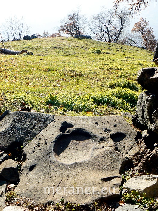Unterhalb des alten Haflingerweges, kurz bevor man den Eggerhof in Labers erreicht, stand einst die Grumser Mühle. In deren Nähe lag bis vor einigen Jahren eine Steinplatte, die an ihrer Oberseite eine sitzähnliche Vertiefung sowie links und rechts davon deutliche Druckstellen aufwies, als ob hier jemand gesessen und sich aufgestützt und dabei seine Spuren im Stein hinterlassen hätte.