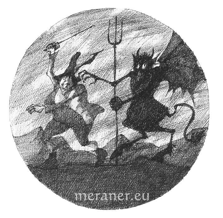 Während der hl. Nikolaus in der Stube die Kinder zum Guten ermahnt, poltert der Krampus vor der Tür mit Rute und rasselnder Kette, dass es zum Fürchten ist. Ein solcher Hausbesuch, wie er vor einigen Jahrzehnten noch üblich war, ist heute überholt und abzulehnen, es muss deswegen aber nicht insgesamt die Gestalt des Teufels aus der Vorstellung und dem Gedächtnis verdrängt werden. Die Volksfantasie hat im Laufe der Zeit diese Figur als Sinnbild des Bösen in schillernden Farben ausgemalt und facettenreiche Darstellungen geschaffen, die heute durchaus neben den Fantasiewelten so mancher Filme bestehen können. Der volksnahe Schriftsteller Hans Matscher hat 1931 einige dieser überlieferten Vorstellungen - mit Humor und Ironie – wie folgt nachgezeichnet.