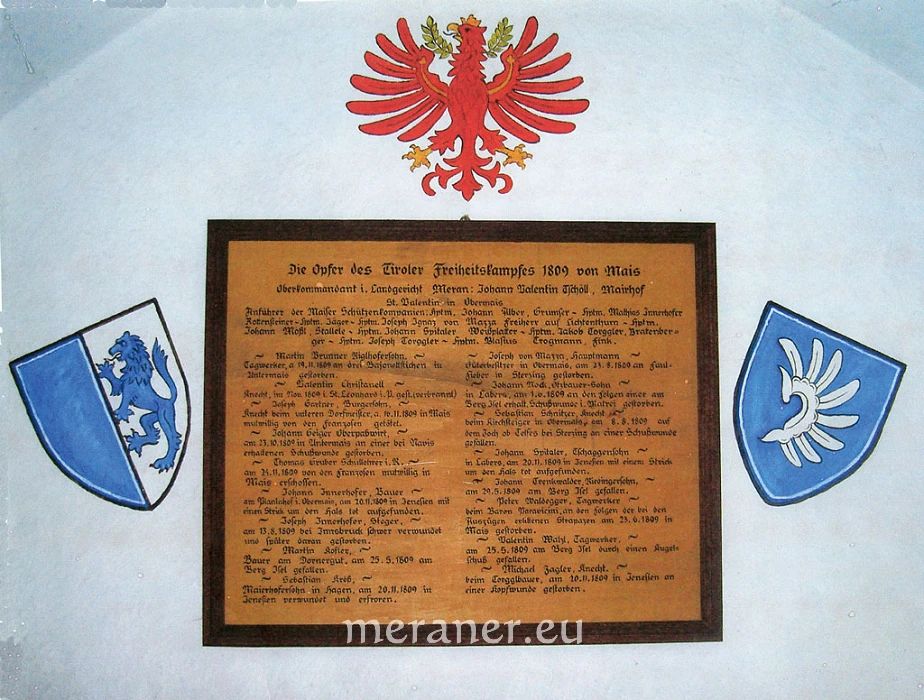 Bei der Renovierung der „Gedächtniskapelle“ am Friedhof Maria-Trost in Untermais haben 1990 Maiser Heimatpfleger und Schützen im Inneren eine Gedenktafel mit den Namen der Opfer von 1809 anbringen lassen. Das Sterberegister der Pfarre Mais verzeichnet diesbezüglich folgende Tote: