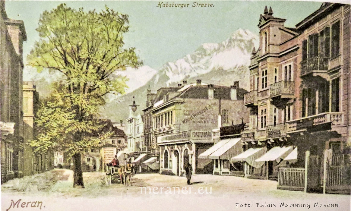 Die geradlinig verlaufende Prachtstraße war dem renommierten k.k.Kurort Meran angemessen. Allein es fehlte ein würdiger Name, den man nur im Herrscherhaus Österreichs finden konnte und wollte: Habsburg. Das repräsentative Entrée der 1884 erstmals im Adressbuch aufscheinenden Habsburgerstraße bildete das Hotel Habsburgerhof (heute Bellevue, 1883 erbaut) und der Kaiserhof (1897 erbaut). Der Name Habsburgerstraße galt bis 1921 und ist im historischen Gedächtnis der Meraner verankert.