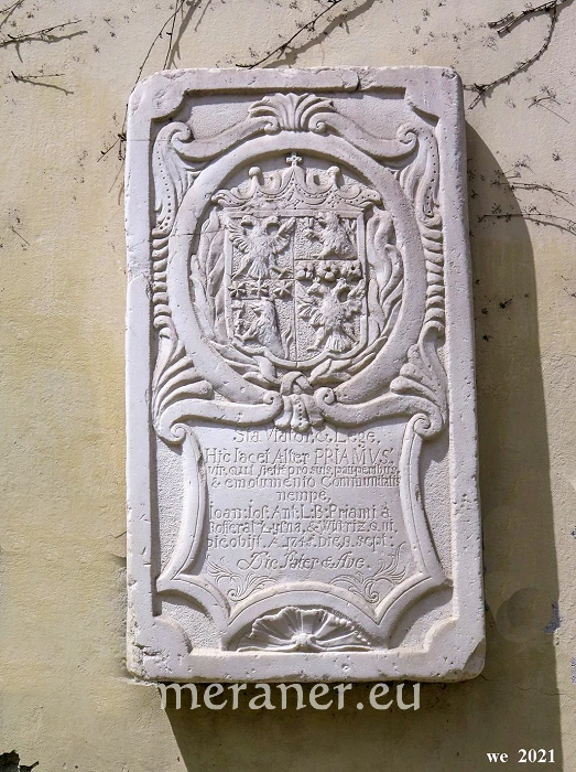 „Sta Viator & Lege.“ Mit diesem Zuruf beginnt die lateinische Grabinschrift auf einer gut erhaltenen, doch kaum beachteten Grabplatte aus weißem Marmor, die beim Sieglerbrunnen in Untermais an der Außenmauer des heutigen Urnenfriedhofs hängt. Sie erinnert an das Adelsgeschlecht der Freiherren von Priami, einst Besitzer von Schloss Rottenstein in Obermais.