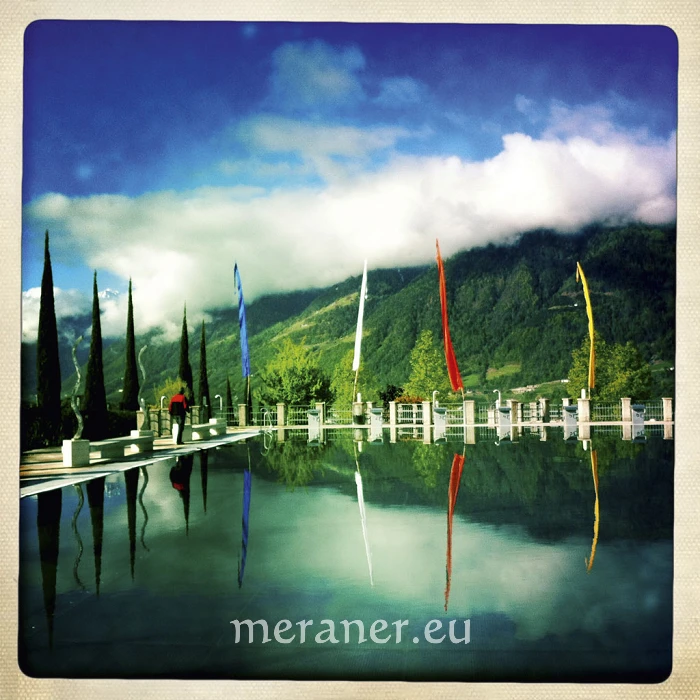 ... ist wohl das schmeichelndste Kompliment und zugleich die treffendste Beschreibung in puncto ‚Lido zum Wasserpark’, die ich in den vergangenen fünf Jahren gehört habe. In der Tat ist das auf dem Westhang über Meran angelegte, an die 4000 qm große Freibad mit dem vielen weißen und rosa Marmor und seinem 33 m langen und 15 m breiten, in Inox gehaltenen Becken untypisch in seiner Art und somit etwas Besonderes. Es ist der ideale Ort, um der Hitze der Stadt zu entkommen und sich auf der großzügigen Grünfläche oder auf einer der marmornen Liegebänke für eine kleine Weile in den redlich verdienten Relaxmodus zu begeben.