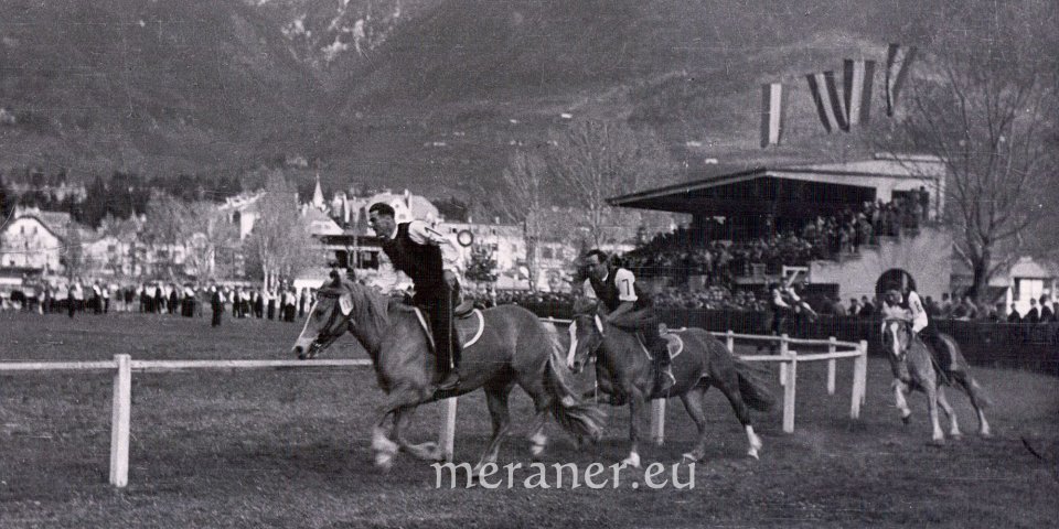 als in Meran ein großes Tiroler Nationalfest organisiert wurde, um Mittel für den Ausbau der Passeirer Straße zu sammeln. Die prominente Wohltäterin Fürstin Pauline Metternich-Sándor übernahm die Patenschaft und verlieh dem Fest Glanz und Aufmerksamkeit. Der Volkskundler und Schriftsteller Karl Wolf, Regisseur des Festes, setzte damals erstmals ein Bauernrennen auf das Programm – unter einer Bedingung der lokalen Bauern: „Nur kleine Pferde vom Haflinger-Schlag sollten zugelassen werden.“ Kuriosum am Rande: Auch wenn sich die Rennen später als Ostermontags-Galopprennen etabliert haben, war es der Osterdienstag, 7. April 1896, als schließlich 23 Haflinger mit ihren Reitern in Sonntagstracht gegeneinander antraten. Die Meraner Hofwiese verwandelte sich in eine provisorische Rennbahn, Tausende säumten die Strecke, Musikkapellen spielten, und die Fürstin eröffnete das Fest persönlich. Das erste Bauernrennen wurde zum Publikumserfolg und legte den Grundstein für eine bis heute andauernde Tradition.