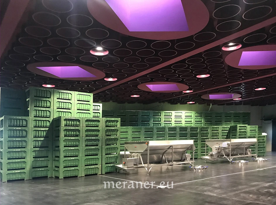 Im Weingut Manincor am Kalterer See besprühte M. A. Mayr die Wand im Empfangsraum, die Teil des historischen Gutshofes war, mit Kupfervitriol. „In Manincor habe ich nach Farbspuren aus der Tradition des Weinguts und des Weinbaus gesucht. Im Vinschgau, im Burggrafenamt, im Überetsch, im Unteralnd oder Eisaktal – überall dort kann man anhand der Spuren des Kupfervitriols an Fassaden ablesen, wo an der Hauswand des Bauernhofes einst eine Rebe gewachsen ist, auch wenn die Rebe längst nicht mehr existiert. Mit Kalkmilch vermischt wird dieses Smaragdblau auf Kupferbasis teils auch heute noch zur Vorbeugung und Bekämpfung der Pilzerkrankungen im Weinbau eingesetzt. Das ist natürlich der Auslöser, wo ich sage, Hollawind, das ist die Farbe die im Kontext zur Kellerei Manincor passt. Noch dazu waren die Grafen Enzenberg die früheren Besitzer des Prettauer Kupferbergwerks im Ahrntal. Sie lieferten vielen Weinbauern das Kupfervitriol für den Einsatz als Pflanzenschutzmittel. Das sind Geschichten die ich zusammentrage und die mich glücklich machen. Diese Verschränkungen von Geschichte, Farbe und Raum, stehen plötzlich ganz selbstverständlich in Zusammenhang mit dem Ort und dem leuchtenden Oxidgrün an der Wand“, erklärt Mayr.