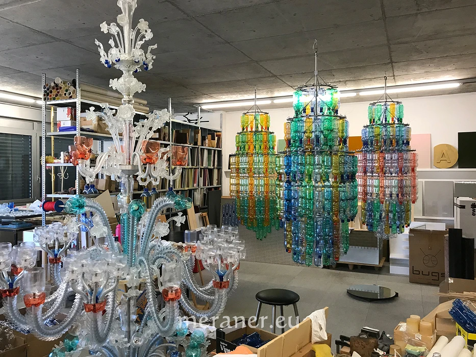 Normalerweise gibt es in der weitläufigen Pobitzer-Passage unter den Meraner Lauben, von Gesprächslauten abgesehen, wenig zu hören. Seit 2020 ertönen jedoch pünktlich um zwölf Uhr ungewohnte Klänge, die sich im Wandel der Monate ändern. In den Ruhepausen erklingt im Stundentakt ein Ton. Schaut man sich neugierig um, beeindruckt die großformatige Installation „Carillon“, kreiert von Manfred Alois Mayr. Er hat im Auftrag von Ernst Pobitzer ein faszinierendes, programmierbares und live bespielbares Klang-Instrument kreiert und die Komponistin Manuela Kerer hat verschiedene Stücke dafür komponiert. Das neue Meraner Glockenspiel verknüpft Ton und Material: Über 10 Meter hoch beeindruckt das raumplastische Materialbild mit 41 Fundstücken aus Metall (Eisen, Aluminium, Rost, Nickel, Gold), die M. A. Mayr am Recyclinghof fand und zum Teil veredeln ließ, verbunden mit 42 Magnet-Hämmern, 1.000 Metern Kabel und einem Schaltkasten mit Zeituhr.