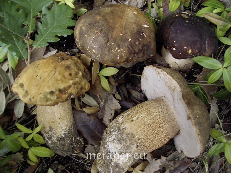 - Die kleinen, dunklen mit abgerundetem Kopf und dickem Stiel sind Steinpilze; die großen mit offenem Hut sind Herrenpilze;