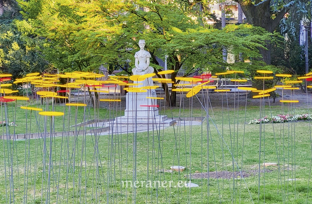 Meran rüstet sich für den Frühling. Für den ersten Frühling im Nachcorona-Zeitalter. Ein paar Omikron-Varianten stehen uns vermutlich noch bevor. Aber das menschenleere Ostern 2020 und das nicht weniger trostlose Ostern 2021 gehören hoffentlich der Vergangenheit an. Also ist es nur recht und billig, dass sich die Kurstadt in eine vorösterliche Schale wirft. Recht vielleicht, ob auch billig, das lassen wir einmal dahingestellt sein. Aber die paar Plastikteller, die auch dann in der Sonne glänzen, wenn es regnet, werden wir uns ja wohl noch leisten können. Schon ein schöner Anblick, wenn man am Eingang zum Elisabethpark steht und zum Sissi-Denkmal schaut. Zu genau sollte man nicht hinschauen. Denn dann würde man sehen, dass die Sissi die Mundwinkel nach unten gezogen hat. Sie ist verschnupft. Also kein Heuschnupfen, nein, nein, verstimmt, verärgert ist die Kaiserin, weil ihr die bunten Plastikteller die Show stehlen. Nicht nur im Elisabethpark, auch auf der Kurpromenade verfolgt mich das bunte Plastikgeschirr, das aussieht, als hätte ein chinesischer Wanderzirkus seine Requisiten in Meran vergessen. Bitte nicht aufregen. Ich weiß, dass es sich um eine Installation handelt. Kunst unter freiem Himmel, Sonnenfänger, die dazu dienen, die öden Promenaden- und Parkanlagen der Kurstadt aufzumotzen. Es ist wie bei den in Mode gekommenen Aussichtsplattformen. Der Berggipfel als Aussichtspunkt allein genügt nicht mehr, wir brauchen auf dem Aussichtspunkt auch noch eine Aussichtsplattform. Apropos Aussicht: Der Begriff Parkplatz hat für mich in Meran jetzt eine völlig neue Bedeutung erhalten. Ich stehe auf dem kleinen, jetzt autofreien Platz vor dem St. Josef-Heim und habe freie Sicht auf einen Park. Die Innerhoferstraße entlang der schrecklichen Mauer beim Hotel Palace würde sich den Namen Parkstraße verdienen. So gesehen gibt es also doch noch Dinge in Meran, über die man sich freuen kann. Jetzt warte ich, wie lange es dauert, bis von meinem „Parkplatz“ oder der „Parkstraße“ aus, der Park wieder in den Hintergrund rückt, weil das Auge von einem Meer bunter Plastikteller geblendet wird, die wunderschön glitzern und leuchten, auch wenn das Wetter beschissen ist. Andererseits: Wozu brauchen wir so etwas? Es regnet ja nicht mehr oft. In Meran schon gar nicht!