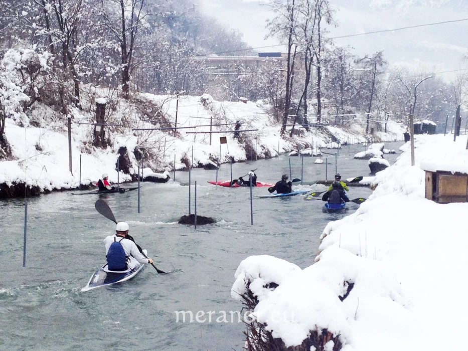 An zehn Samstagabenden hat die Kanusektion außerdem das Hallenbad in der Meranarena gemietet. Dort treffen dann alle aufeinander: Neulinge, die im kleinen Becken die Eskimorolle lernen, Leistungssportler, welche im großen Becken an der Technik feilen sowie jung gebliebene Mitglieder, die nebenan in den abgetrennten Schwimmbahnen ihre Runden drehen. Das Hallenbadtraining läuft in der Regel bis Anfang März - wenn die Tage bereits länger sind und die Kanuten sich wieder mehr auf das Wildwassertraining konzentrieren. Anfang April beginnt nämlich die neue Wettkampfsaison an. Erfreulicherweise finden heuer gleich zwei Höhepunkte in Meran statt: Ende Mai die Italienmeisterschaften der Junioren auf der Passer und Ende August die nationalen Meisterschaften der Ragazzi sowie das Masters auf der Etsch in Marling.