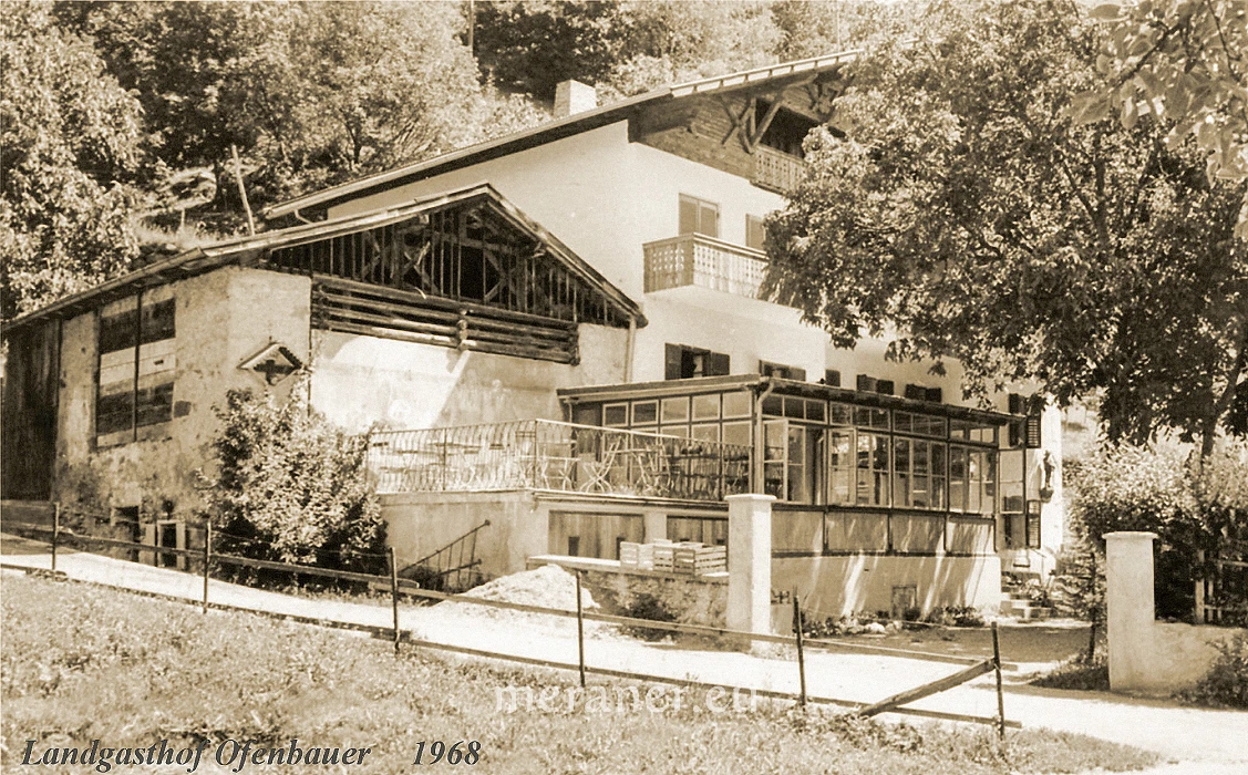Max Rohregger nannte sein Gasthaus bzw. Café-Restaurant „zum Ofenbauer“, womit er zum ursprünglichen Hofnamen zurückkehrte, während die erst jüngst entstandenen Benennungen „Frankonia“ und „Schennaer Niederhof“ dem allmählichen Vergessen anheimfielen. Der alte Hofname geht zurück auf einen 1394 urkundlich erwähnten Weinacker in der Lazag, der wohl wegen seiner warmen Lage „Oven“ genannt wurde.